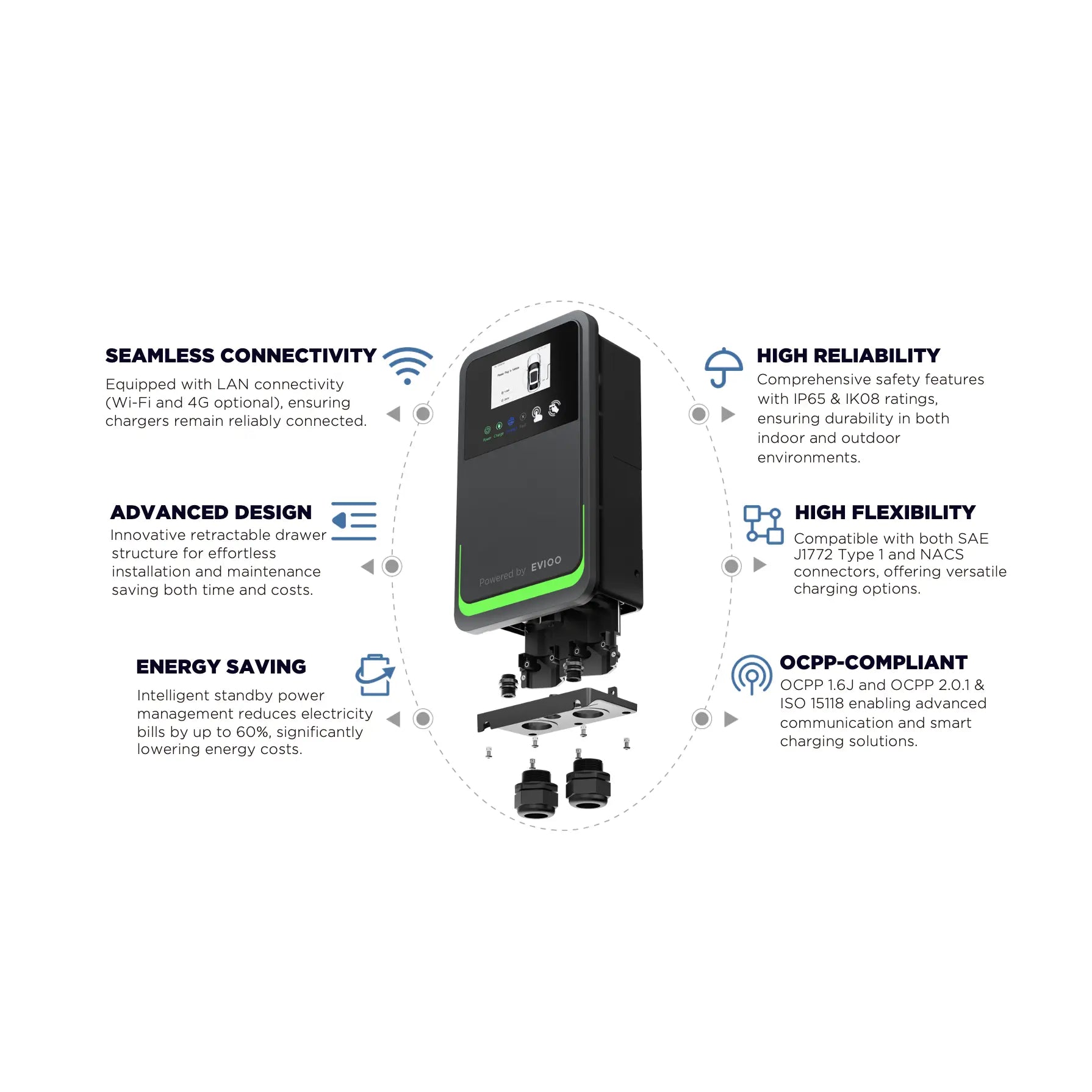EVIQO AC Commercial Charging Station is a cutting-edge EV charging solution designed specifically for businesses that require reliable, efficient, and versatile charging infrastructure.