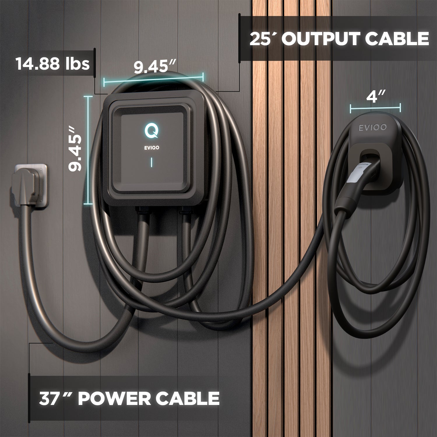FIRST-IN-CLASS: EVIQO level 2 EV chargers offer EXTRA LONG EV charging cable 25' and EXTRA LONG 37" input cable.